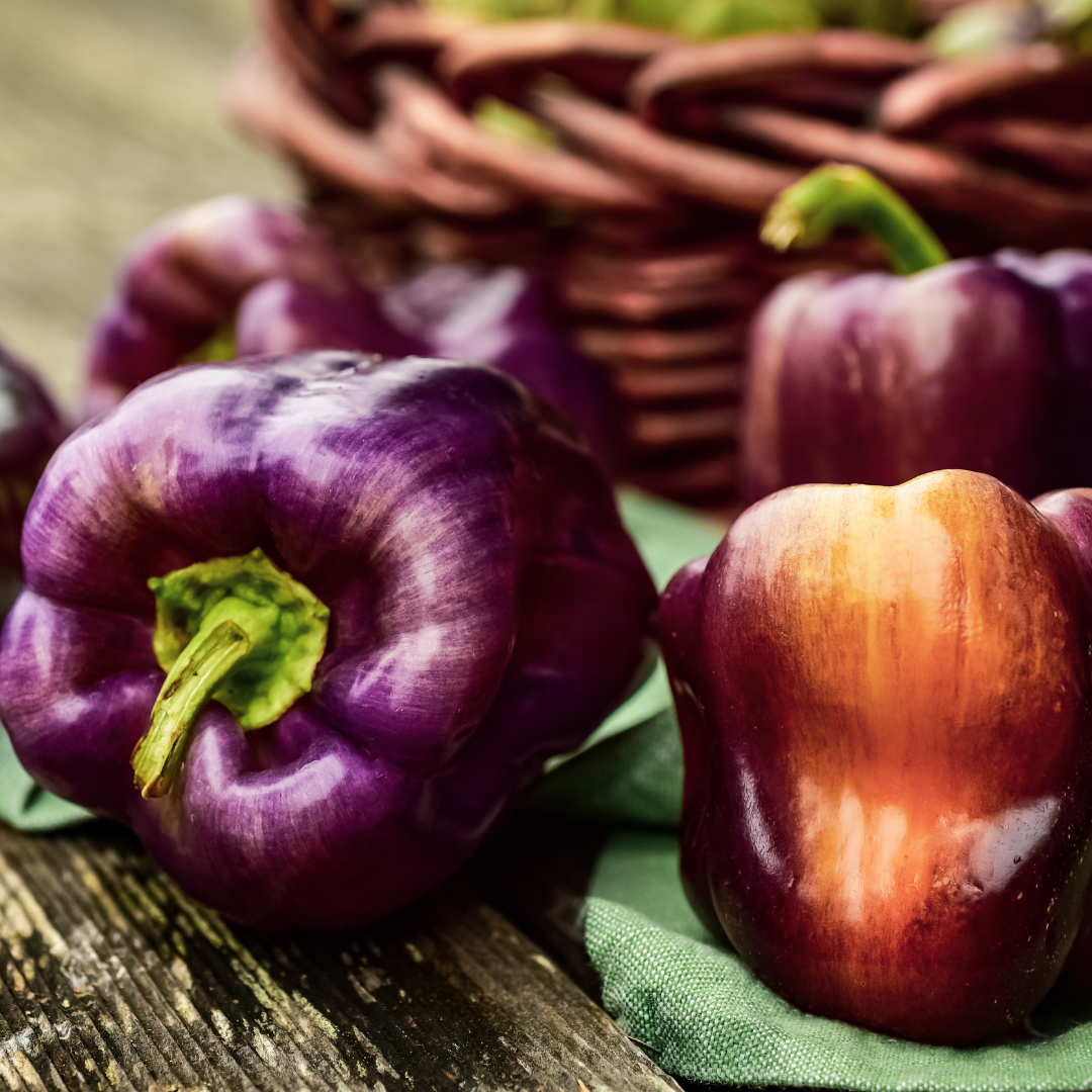Beautiful coloring with a mild, slightly sweet taste. Fruits start off violet with some yellow and orange streaks turning to a dark, rich red. Strong medium-size plants are a high yielder and quick to produce 3-lobed medium-size peppers.
